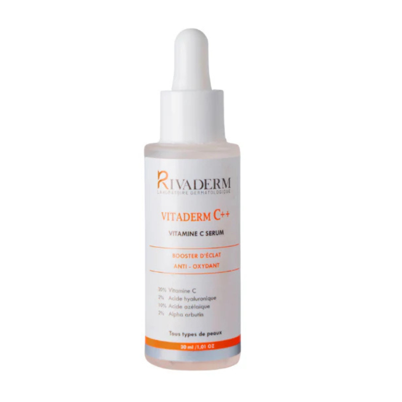 Rivaderm C++ sérum vitamine c 30ml est un soin intensif 4 en 1 hautement antioxydant riche en vitamine c stabilisée multiforme , acide hyaluronique a faible poids moléculaire arbutine , panthenol , et acide azélaïque.